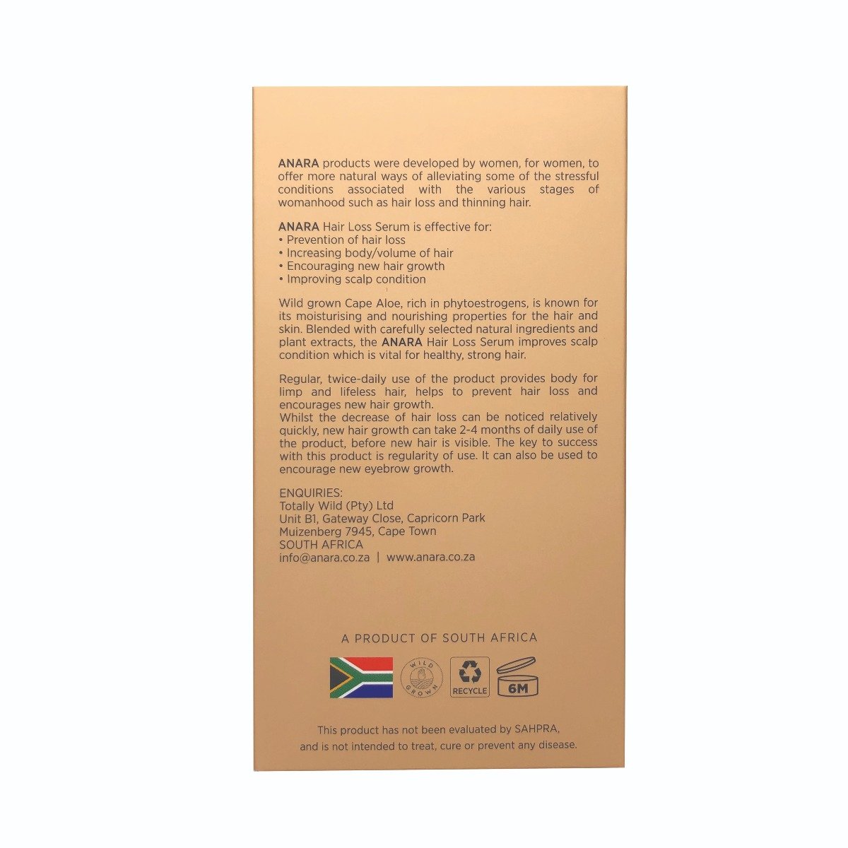 Anara Hair Loss Serum has been developed by women, for women, to offer natural ways of alleviating some of the stressful conditions associated with the ageing process such as hair loss and thinning hair.The ANARA Hair Loss Serum has been formulated for:- Prevention of hair loss- Increasing body/volume of hair- Encouraging new hair growth- Improving scalp conditionThis serum contains wild grown Cape Aloe, rich in phytoestrogens, and known for its moisturising and nourishing properties for the hair and skin.